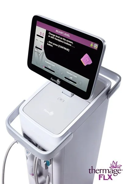 Thermage FLX uses advanced radiofrequency technology to help stimulate the production of collagen and elastin and tightening your skins foundation over time .